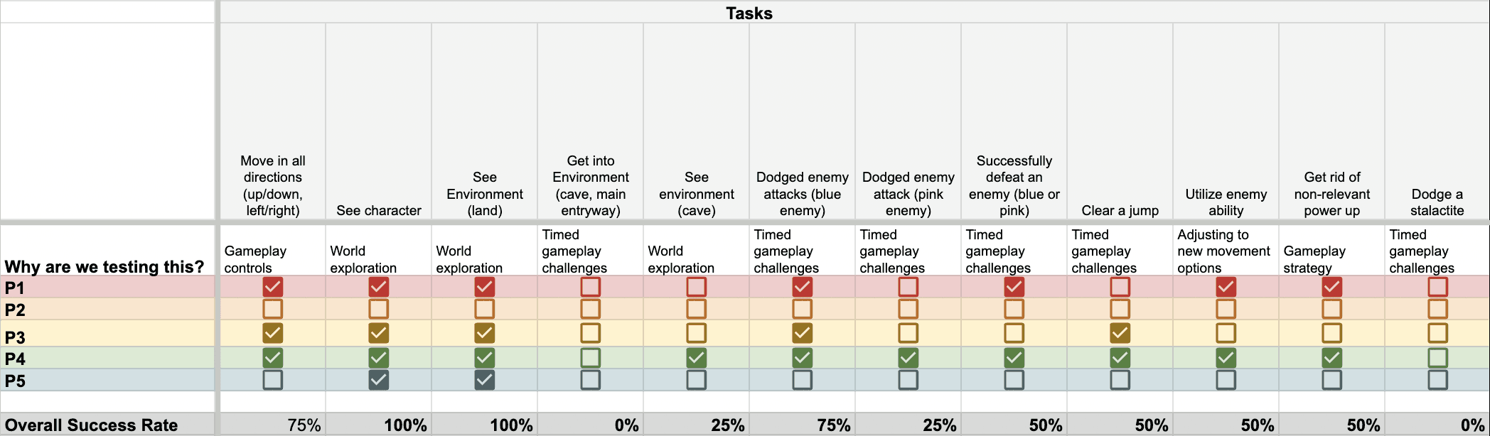 To synthesize our findings we used an affinity map for user interviews and a rainbow sheet (pictured below) for user testing.